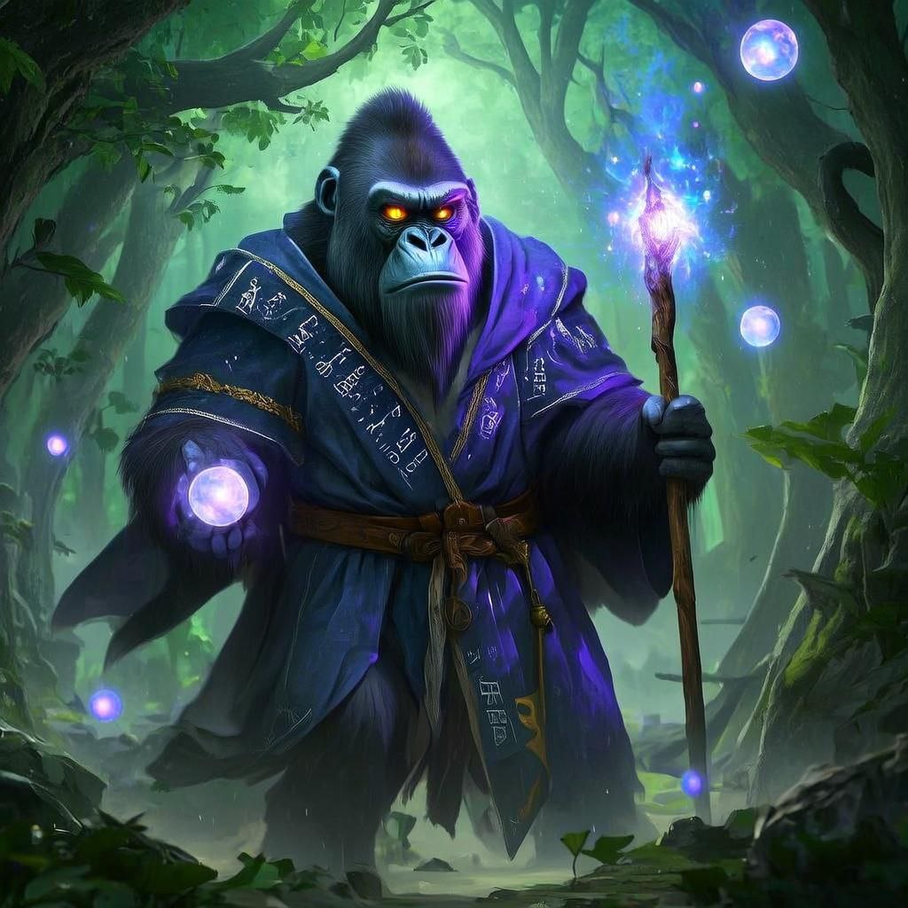 В глубинах Зачарованного Леса, где туман никогда не рассеивается и обитают три сестры, а деревья шепчут древними языками, затерянными даже в памяти богов, обитает существо, о котором повествуют лишь фрагменты запрещённых рукописей из Некрономикона — Горилла Чародей, известная в легендах как Кр’уггат, Шепчущий в Ветвях.