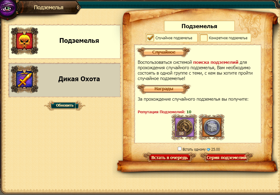 Выбираем - Конкретное подземелье. Стоимость одиночного похода 25 брюлей.