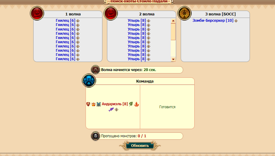После нахождения охоты и готовности всех участников артефакт исчезнет и будет 1 минута на подготовку к первой волне.